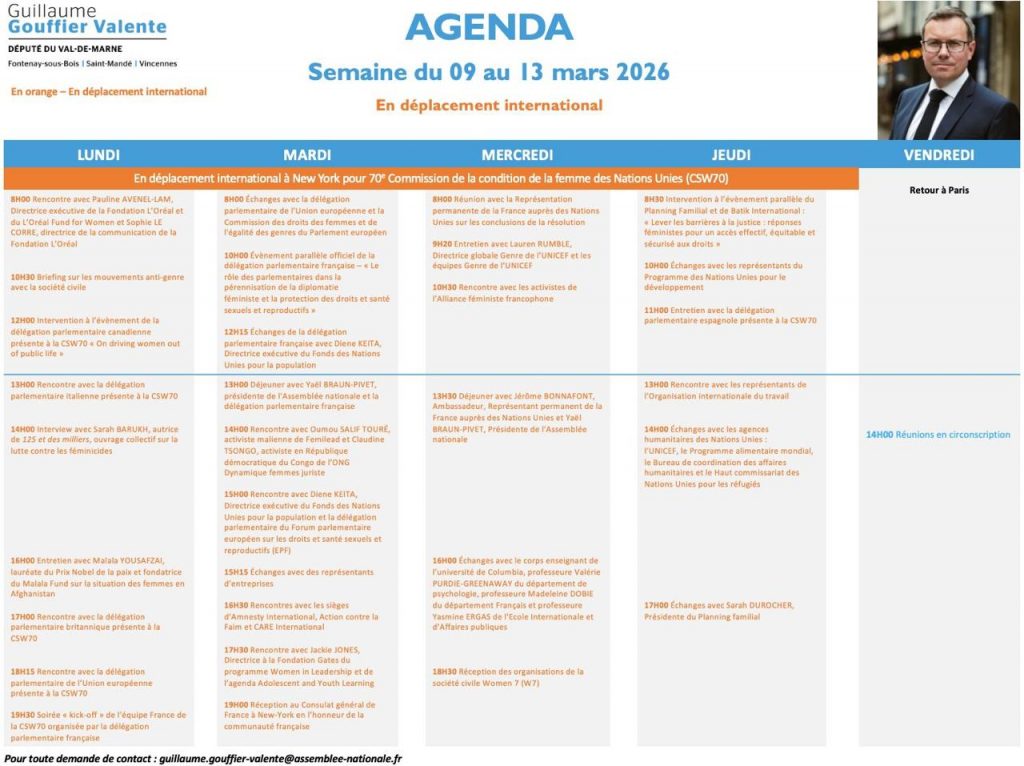 À l’occasion de la 70ᵉ session de la Commission de la condition de la femme des Nations unies (CSW), j’ai conduit à New York une délégation parlementaire française engagée pour les droits des femmes aux côtés de la présidente de l’Assemblée nationale Yaël Braun-Pivet. Dans un contexte international particulièrement tendu, marqué par un recul préoccupant de ces droits, et en particulier des droits sexuels et productifs, notre déplacement avait pour objectif de défendre les acquis, de porter la voix de la France et de renforcer nos alliances avec les acteurs internationaux mobilisés pour l’égalité de genre et la défense des droits des femmes et des filles.